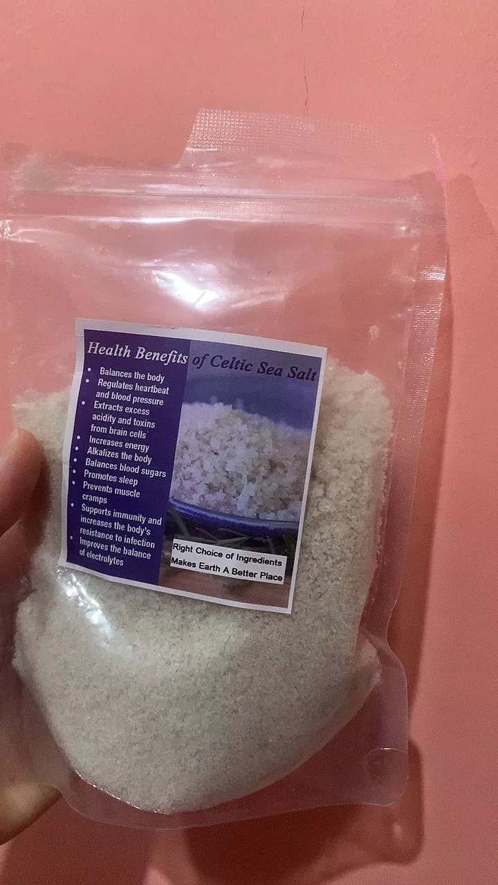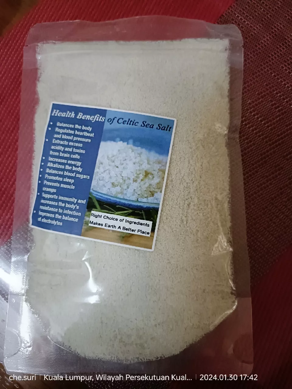 "Dah seminggu saya cuba amalkan Celtic salt. Sangat2 berkesan rambut gugur dah berkurang badan terasa ringan tidak terasa dahaga semasa bulan puasa apabila minum masa sahur. Saya dapat kualiti tidur yg bagus. Amat2 digalakkan untuk mencuba."